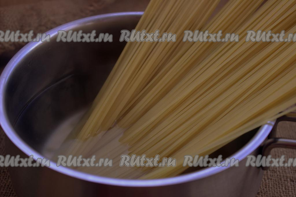 Тем временем отварить спагетти, для этого в широкую кастрюлю влить воду, поставить на огонь. Когда вода закипит, посолить её, уменьшить огонь, выложить спагетти, аккуратно перемешать и варить до готовности (продолжительность варки можно посмотреть в инструкции на упаковке). Готовые спагетти откинуть на дуршлаг, дать стечь воде.