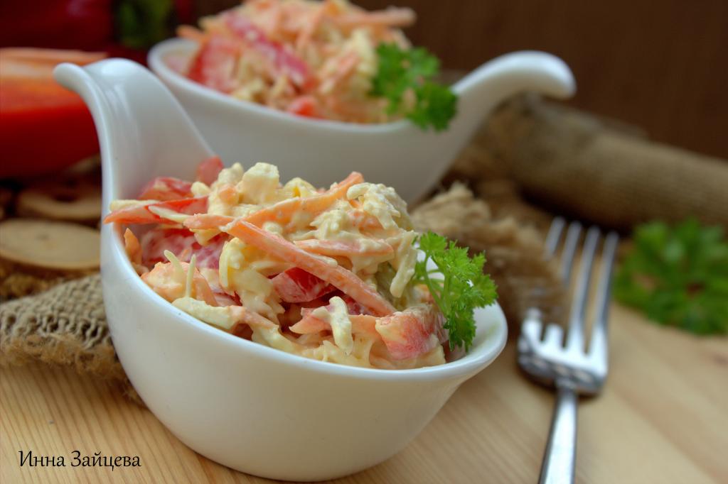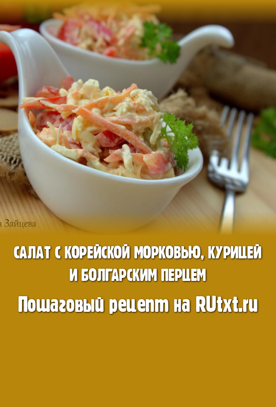 Салат с курицей, сыром, корейской морковью и болгарским перцем получается ярким, очень вкусным, к тому же ещё и достаточно сытным. Приготовив такой салатик, вы ещё не раз вернётесь к этому простому и удачному рецепту!