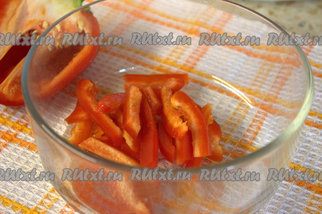 Удалить из болгарского перца перегородки и семена, а затем нарезать его тонкими брусочками и переложить в миску.