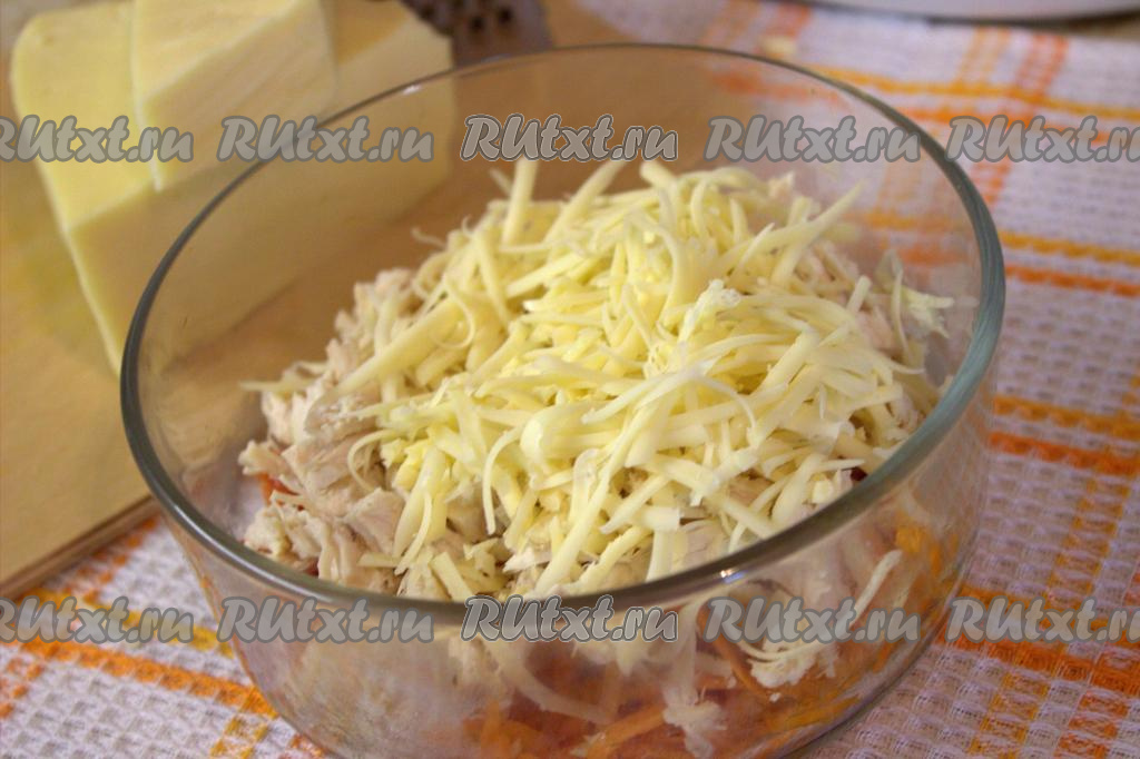 В салат из болгарского перца, куриного мяса и корейской морковки добавить сыр, натёртый на средней тёрке.
