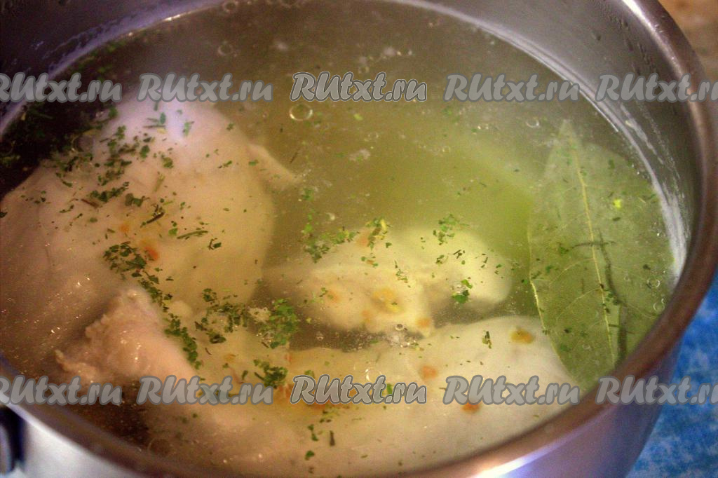 В кастрюлю подходящего размера влить холодную воду, довести на огне до кипения, затем аккуратно выложить промытое куриное филе. Посолить воду, добавить лавровый лист, приправить по вкусу и, доведя до кипения, уменьшить огонь до минимума, варить филе до готовности (примерно, 25 минут). Готовность куриного мяса проверить, вытащив из бульона кусочек и разрезав его вдоль. Если мясо однородного светло-серого цвета - значит готово.
