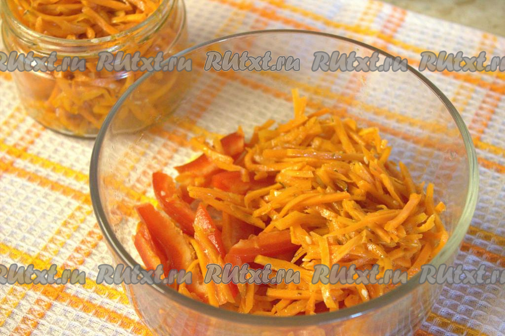 Корейскую морковку нарезать на небольшие полоски и выложить в миску к болгарскому перцу.