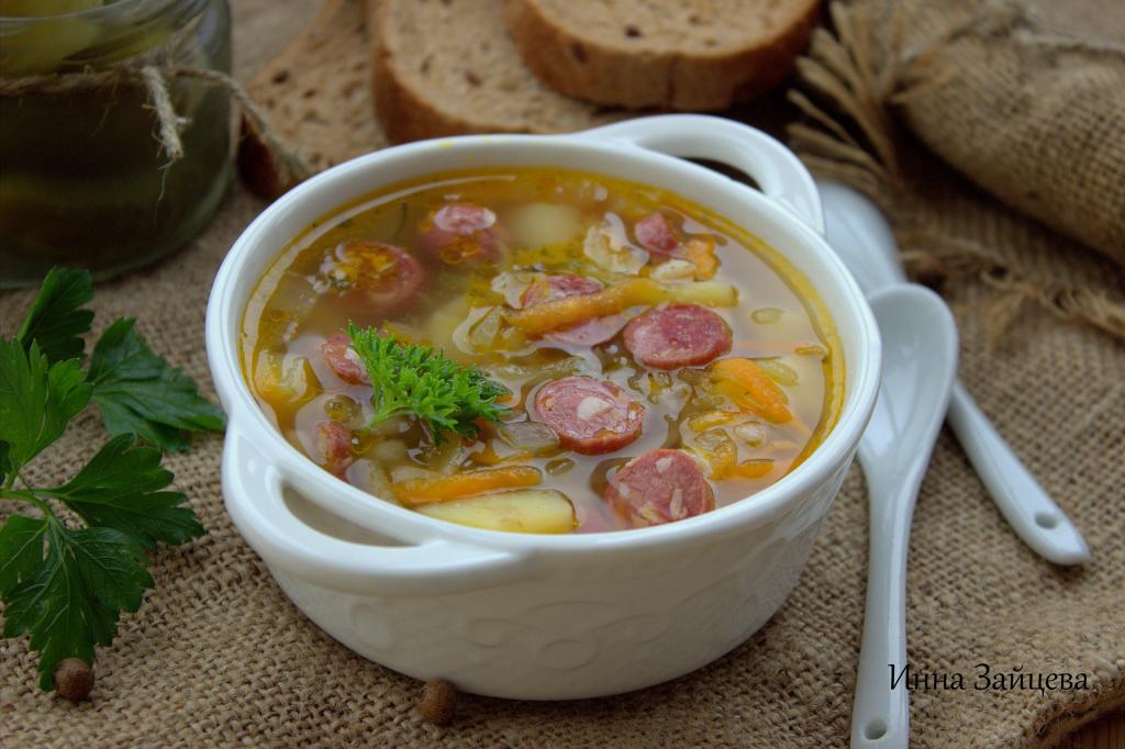 Как только картошка и перловка будут полностью готовы, добавить в кастрюлю обжаренные овощи с солёными огурцами и копчёными колбасками.