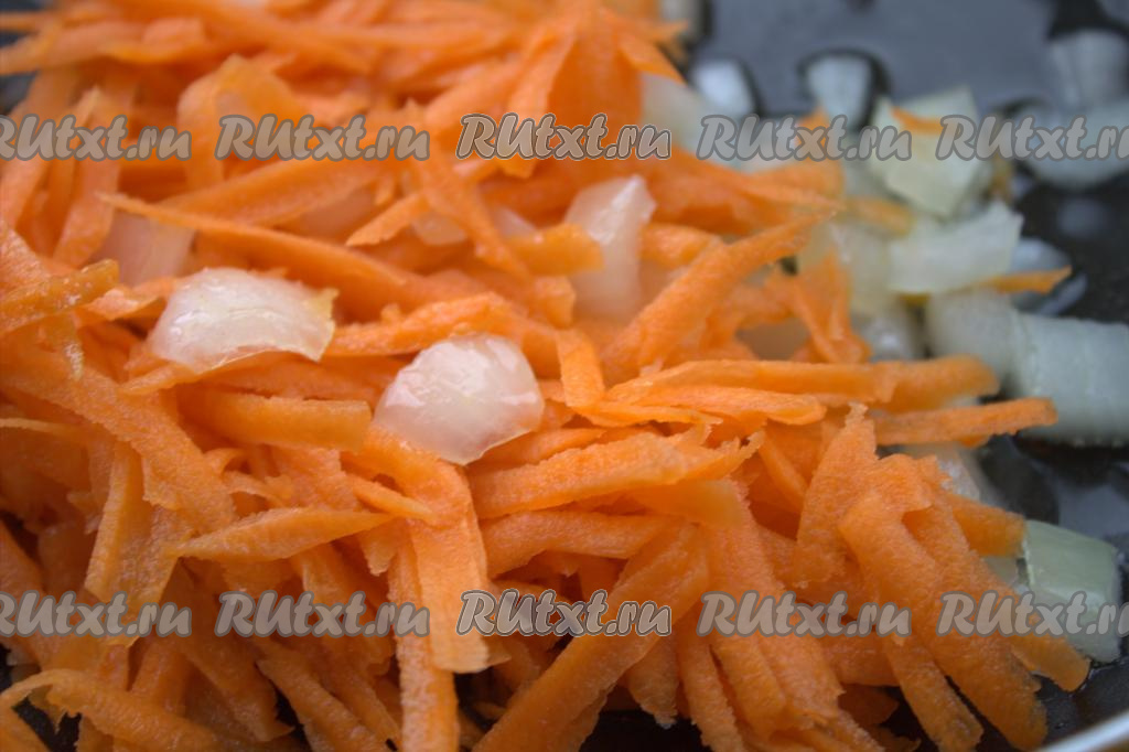 Затем морковь добавить в сковороду к луку. Обжаривать овощи в течение 5-7 минут на среднем огне, помешивая.
