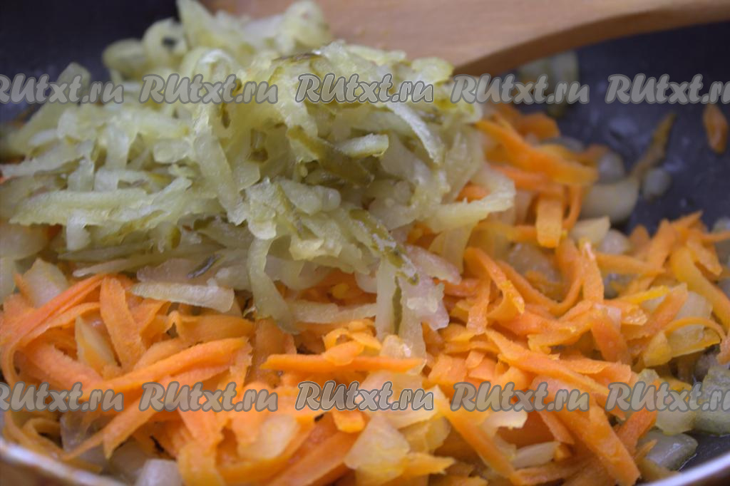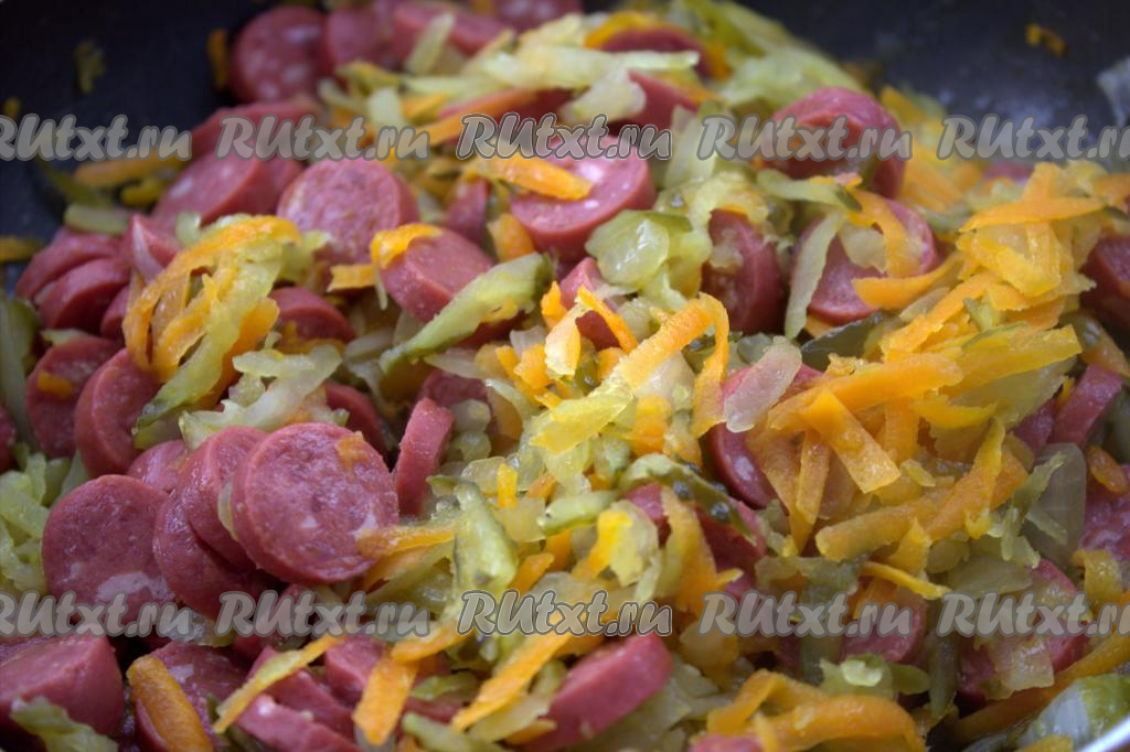 Хорошо перемешать и тушить колбаску с луком, морковью и солёными огурцами, примерно, 5 минут на среднем огне, иногда перемешивая.