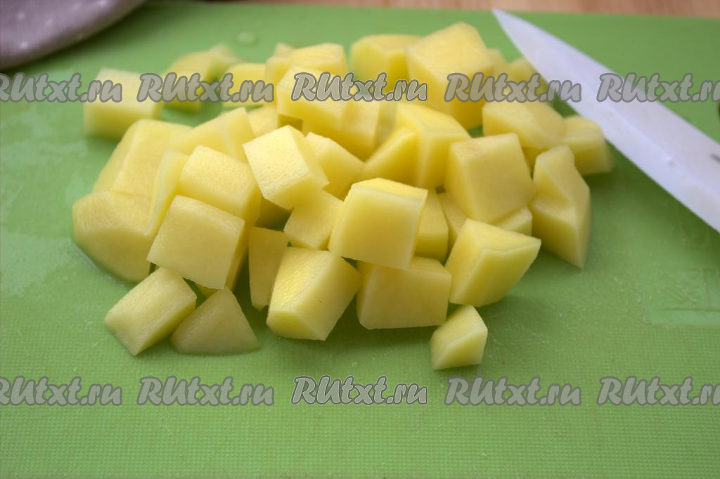 Пока варится перловая крупа, картофель вымыть, очистить от кожуры и нарезать средними кубиками.