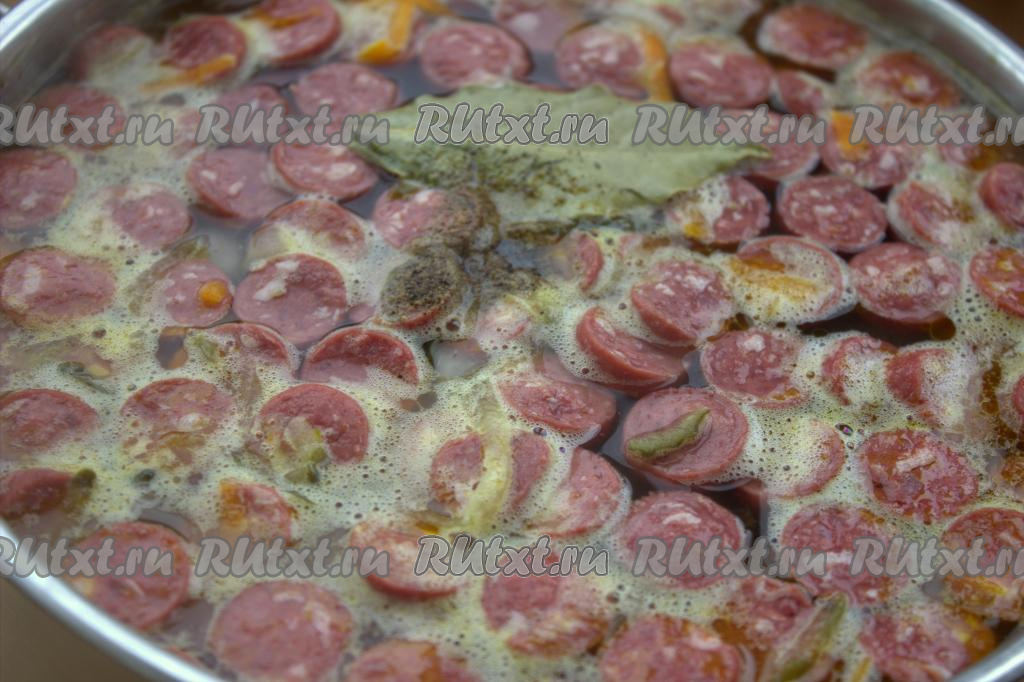 Приправить, посолить по вкусу, добавить лавровый лист. Варить рассольник с колбасой, перловкой и солёными огурцами 7-10 минут на среднем огне. Затем выключить огонь, накрыть кастрюлю крышкой и дать супу настояться минут 10-15.