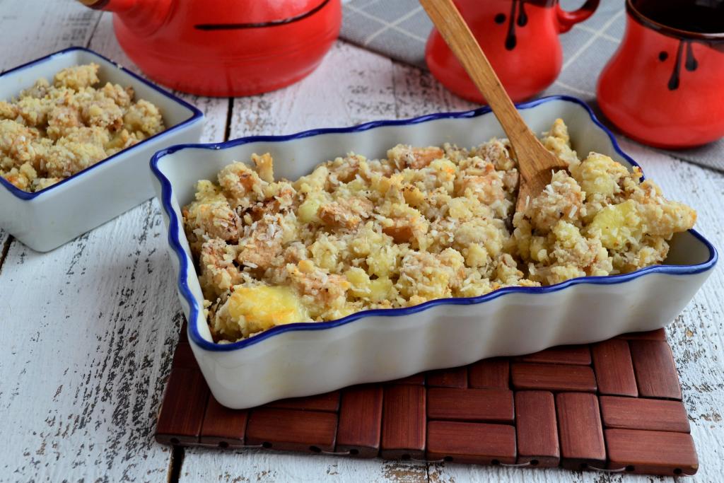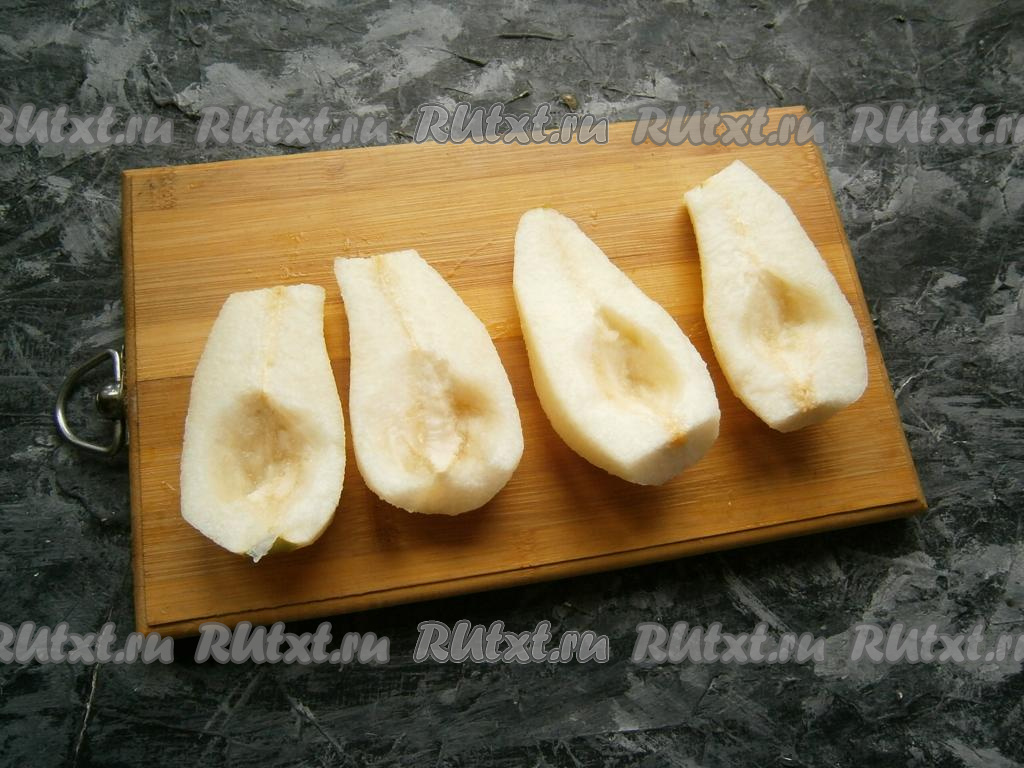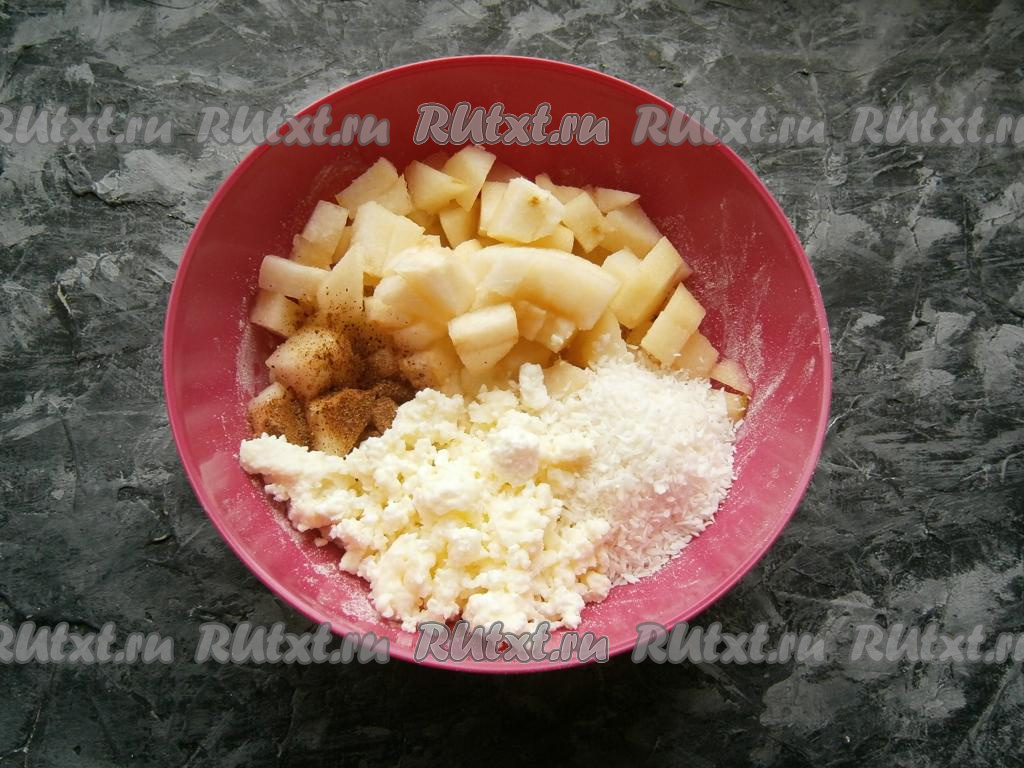Нарезать груши средними кубиками в отдельную миску, добавить к ним кокосовую стружку, сахар, корицу и творог.