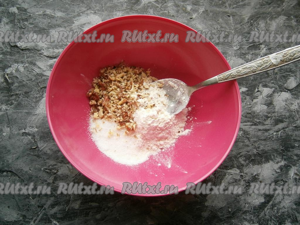 Сливочное масло заранее достать из холодильника, чтобы оно немного размягчилось. Приготовить крошку для крамбла, для этого нужно в миску всыпать сахар, муку, добавить грецкие орехи.