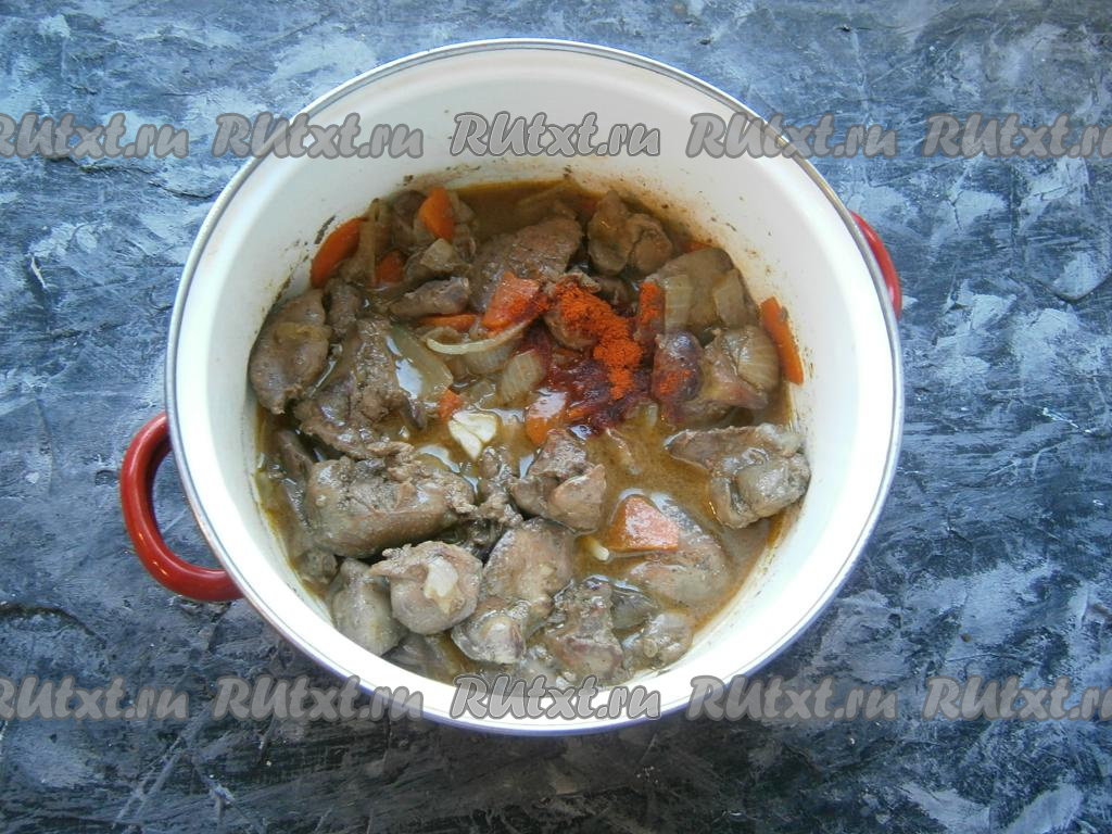 Тушить куриные сердечки с печенью на небольшом огне под прикрытой крышкой минут 20, после чего добавить паприку и измельчённый чеснок, перемешать и протушить ещё 5-10 минут. По прошествии времени печёнка останется сочной и мягкой, а сердечки успеют полностью приготовиться.