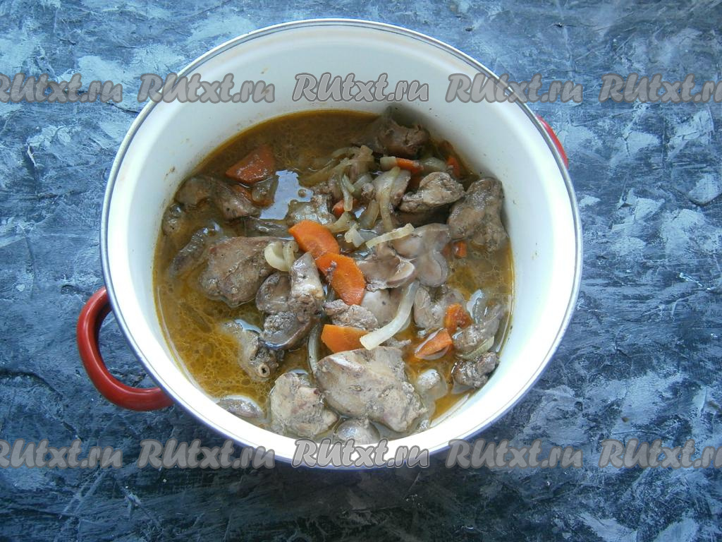 Перемешать и обжаривать также на сильном огне до испарения жидкости и лёгкого зарумянивания субпродуктов. Переложить содержимое сковороды в кастрюлю, влить 100 мл горячей воды. Если нальёте больше, субпродукты будут не тушиться, а вариться.