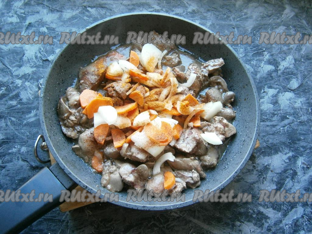 Обжарить сердечки с печенью на растительном масле, прикрыв сковороду крышкой, на достаточно сильном огне, периодически перемешивая, в течение минут 5. Затем добавить нарезанные лук с морковью, соль, перец и приправу для курицы.