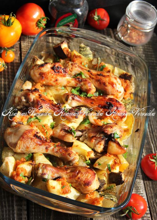 Хочу предложить рецепт экспресс ужина из куриных ножек, запечённых с овощами в духовке. Можно взять любые овощи, которые оказались под рукой. Я использовала кабачок, баклажан, болгарский перец, картошку и лук. Готовится блюдо достаточно просто - маринуем куриные ножки в аджике, выкладываем нарезанные овощи и голени в форму и отправляем в духовку. У нас есть 40 минут для того, чтобы приготовить салатик и накрыть стол. Куриное мясо, запечённое с овощами по этому рецепту, порадует и простотой приготовления, и восхитительным вкусом, и замечательным ароматом, попробуйте!