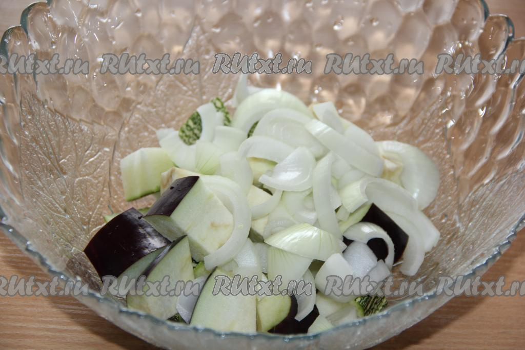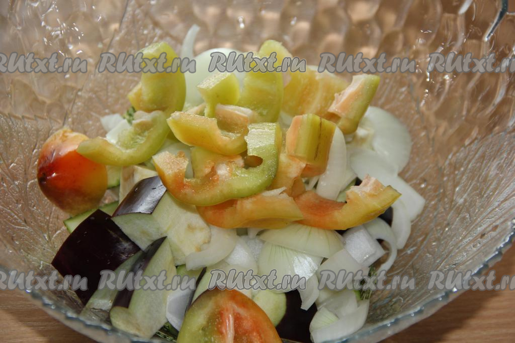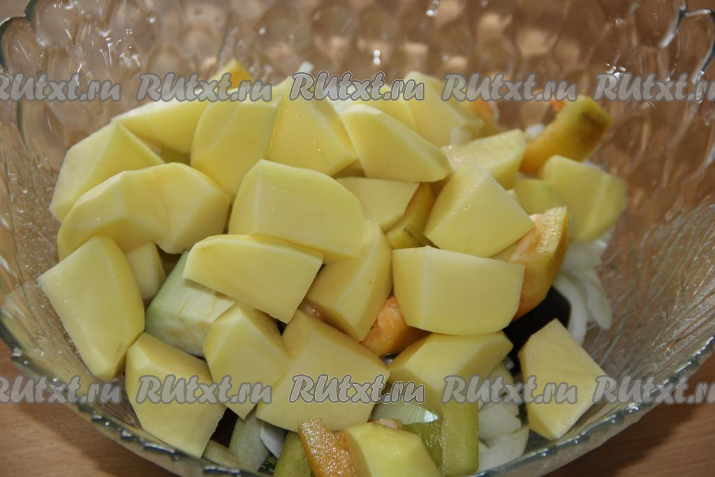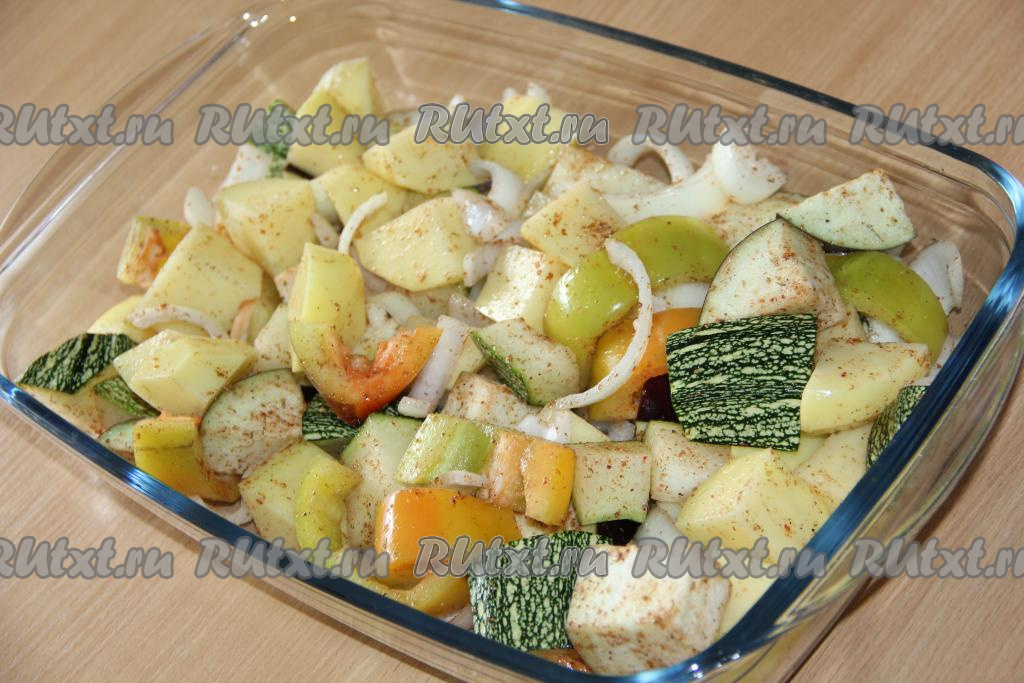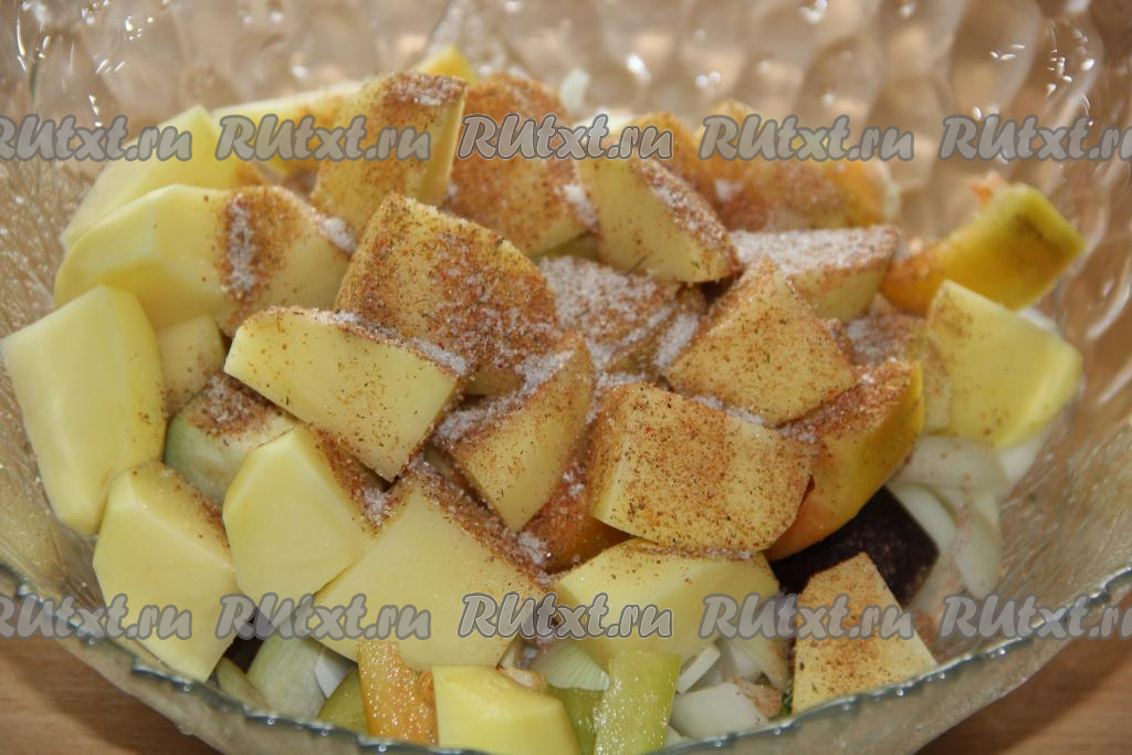 Соединить нарезанные кабачки, баклажаны, лук, болгарский перец и картофель, добавить соль и специи, сбрызнуть растительным (или оливковым) маслом.