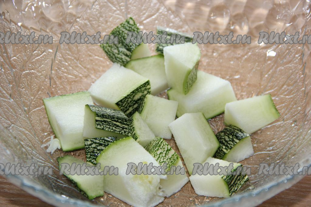 Кабачок вымыть и нарезать на кубики размером 2х2 см. У меня был кабачок с тонкой и нежной шкуркой, поэтому я её не срезала.