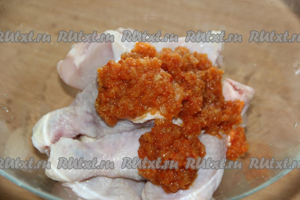 Куриные ножки промыть под водой и обсушить. Добавить к ножкам аджику и перемешать. Оставить курицу мариноваться минут на 20, пока чистим и режем овощи.