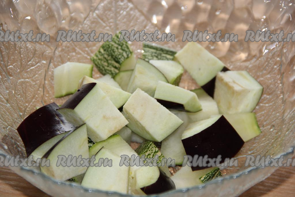 Баклажан вымыть и нарезать на кубики размером 2х2 см.