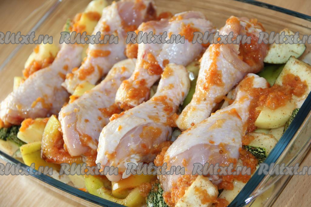 Поверх овощей выложить куриные ножки, замаринованные в аджике.