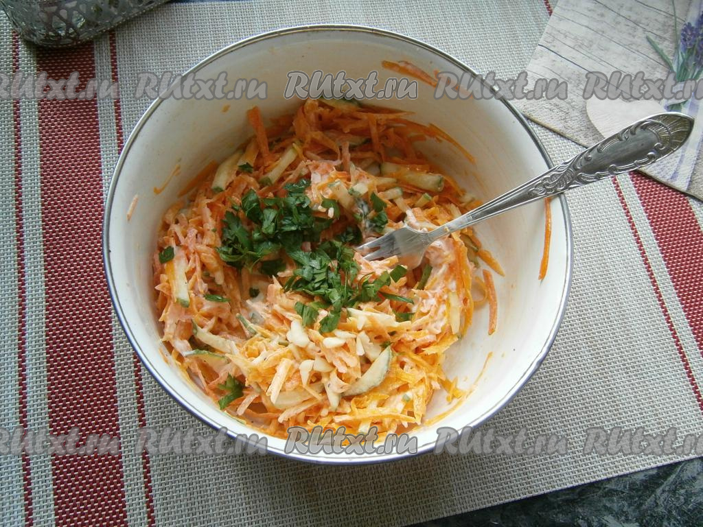 Перемешать получившийся тыквенно-морковный салат, добавить измельчённую петрушку и мелко нарезанный зубчик чеснока.