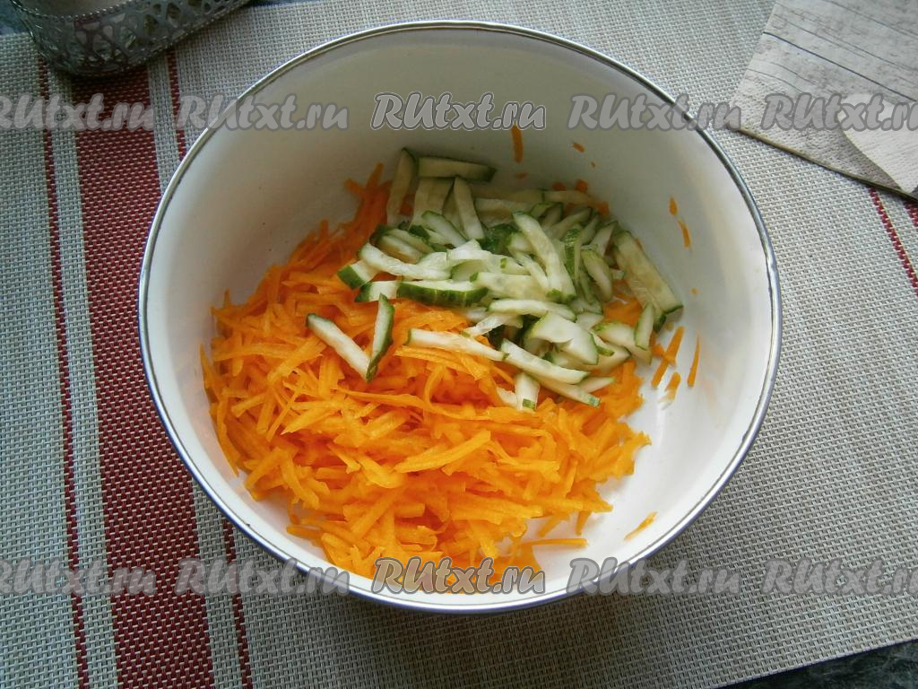 Овощи предварительно вымыть. Очистить тыкву от кожуры и семян. Для приготовления этого салата понадобится 200 грамм очищенной тыквы. Натереть мякоть тыквы на крупной тёрке, добавить нарезанный тоненькой соломкой свежий огурчик.