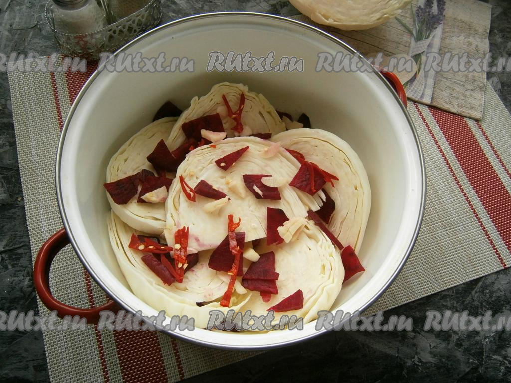 В кастрюлю складывать ломти капусты рядами, пересыпая их свеклой, чесноком и колечками горького перца.