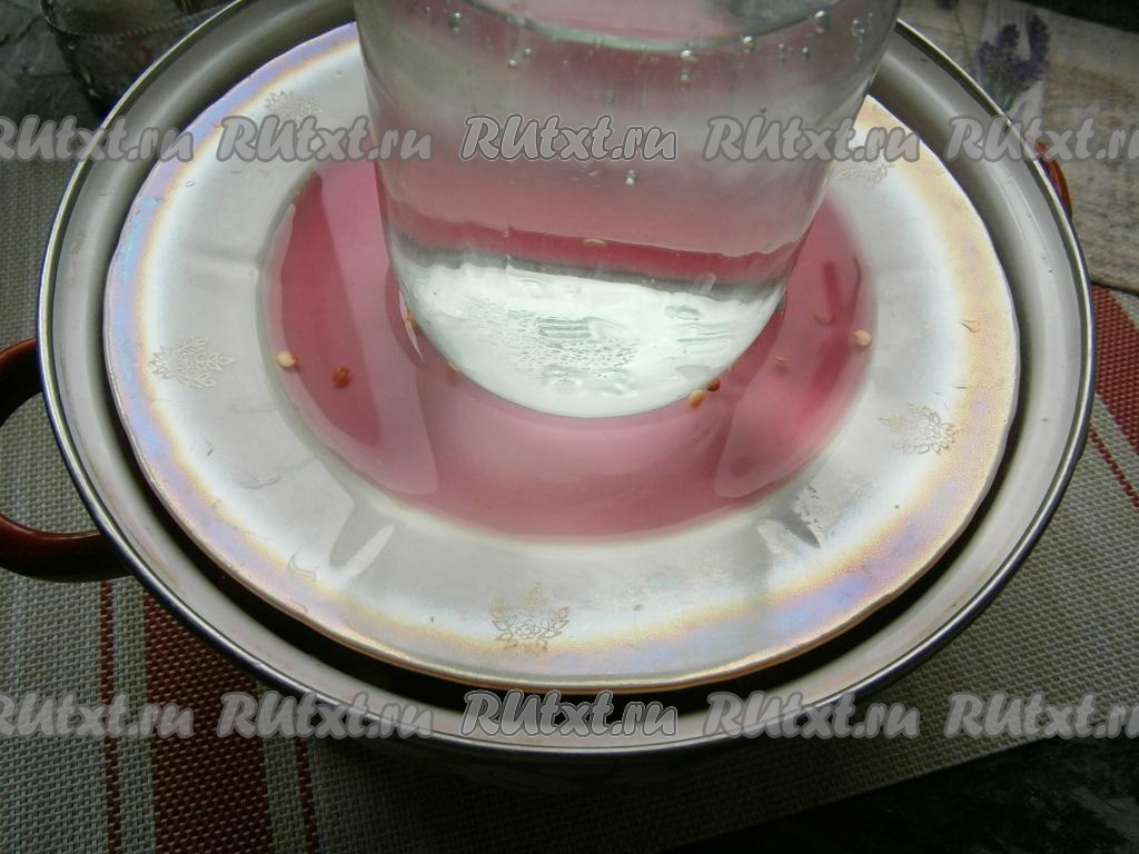 Сверху разместить тарелку и поставить небольшой груз (у меня - 0,5-литровая банка с водой). Оставить капусту при комнатной температуре до полного остывания, а затем перенести в прохладное место на сутки.