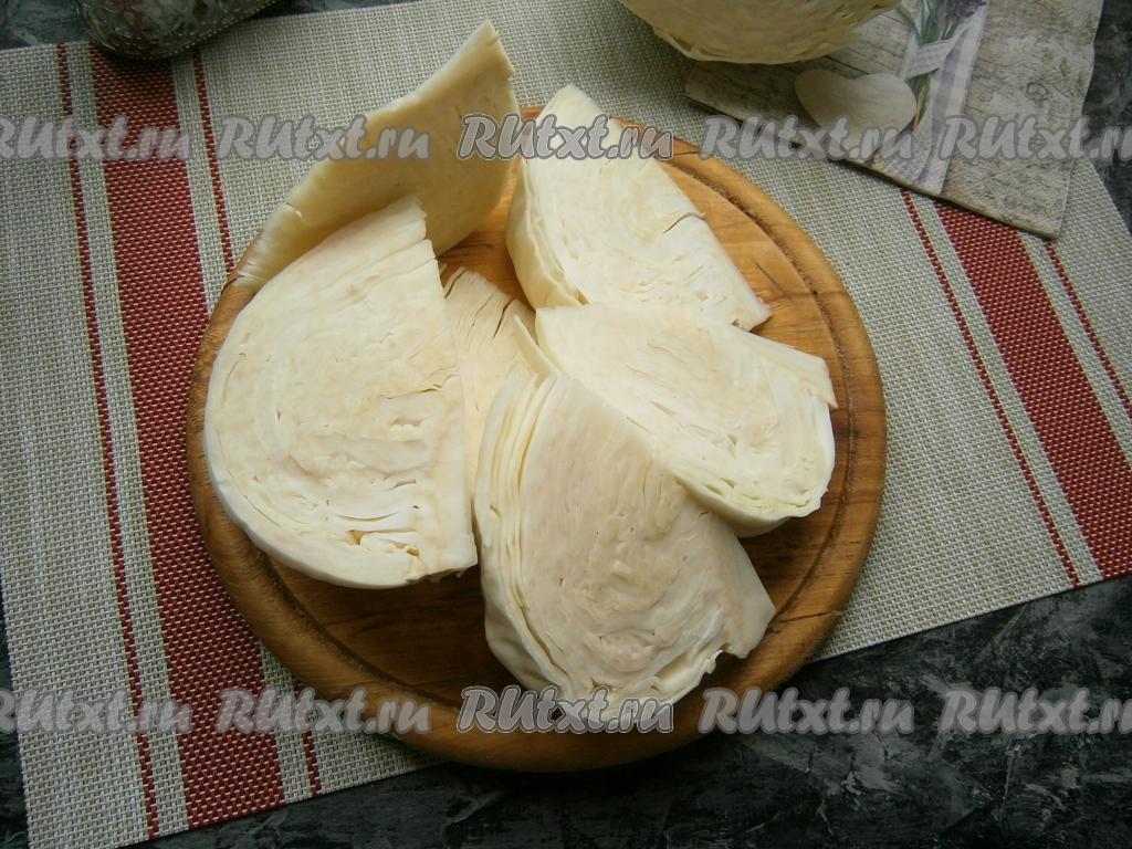 Капусту нарезать на ломти так, чтобы на них остались части кочерыжки - таким образом капуста не развалится и ломти останутся целыми.