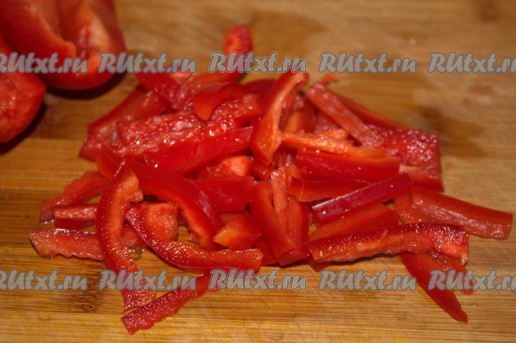 Болгарский перец, очищенный от семян и плодоножки, нарезать тонкими брусочками.