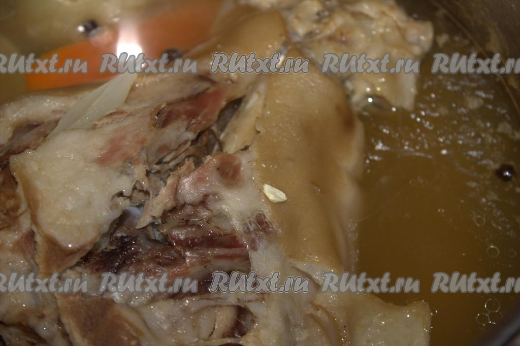 Готовую свиную рульку достать из бульона, выложить на рабочую поверхность. Сделать на рульке продольный надрез, отделить мясо от кости, разложить в пласт (если есть крупные кусочки мяса, разрезать их ножом).