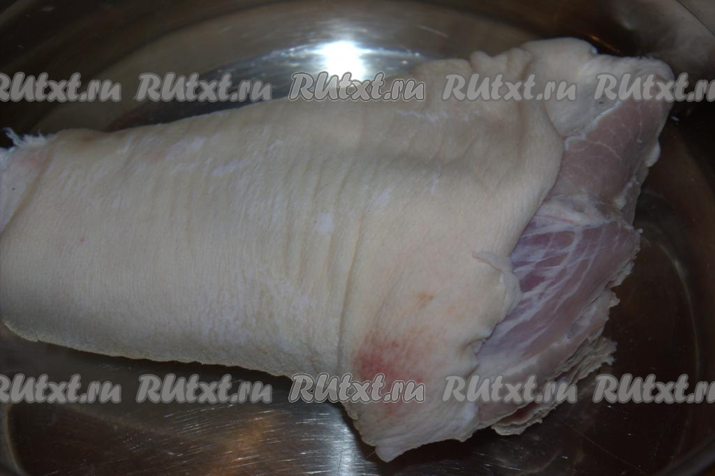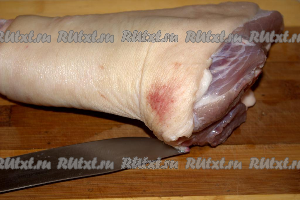 Свиную рульку хорошо промыть, затем на 2-3 часа замочить в холодной воде. По прошествии времени при помощи ножа (или металлической губки) тщательно очистить шкурку от грязи. Ещё раз тщательно промыть.