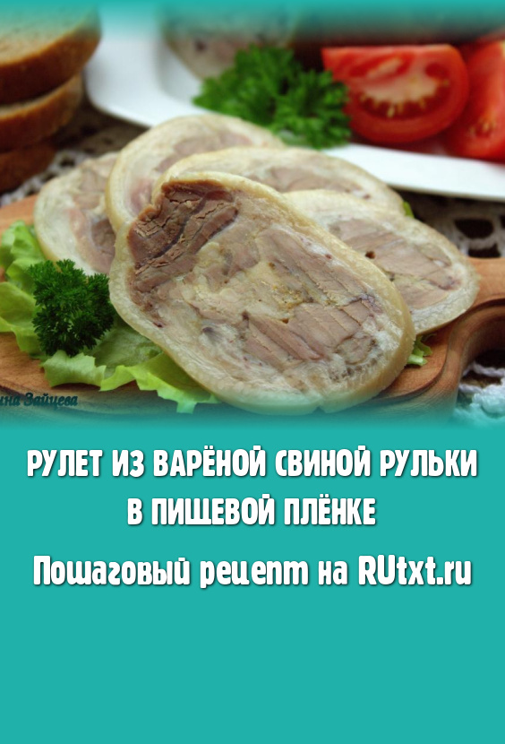 На пищевую плёнку выложить пласт мяса, завернуть плотно в рулет. Рулет из варёной свиной рульки должен быть достаточно хорошо завёрнут в пищевую плёнку (он должен хорошо держать форму). Можно поверх пищевой плёнки перевязать рулет ниткой.