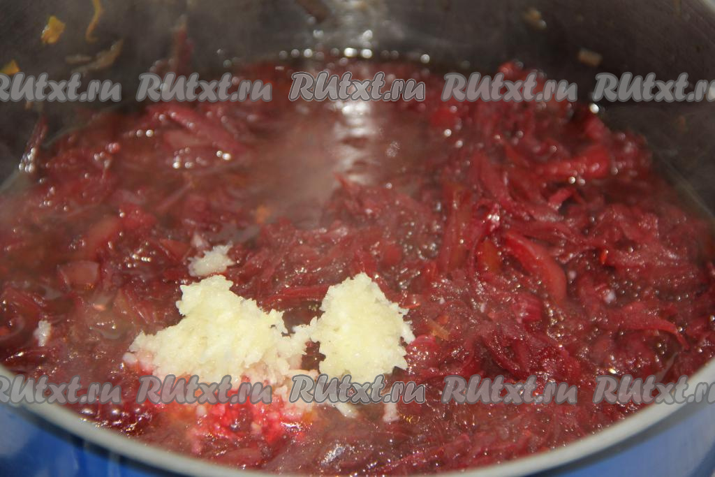 По прошествии 45 минут добавить в кастрюлю очищенный и пропущенный через пресс чеснок, перемешать.