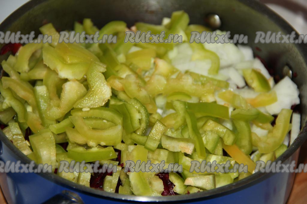В кастрюлю выложить свеклу, перец и лук.