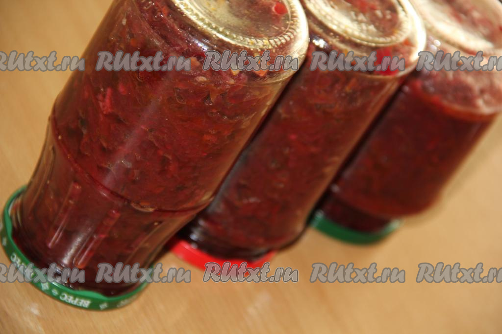 Разложить горячий свекольный салат по простерилизованным банкам, закрутить (или закатать) прокипячёнными крышками. Баночки перевернуть вверх дном, укутать, а после полного остывания убрать в кладовку.