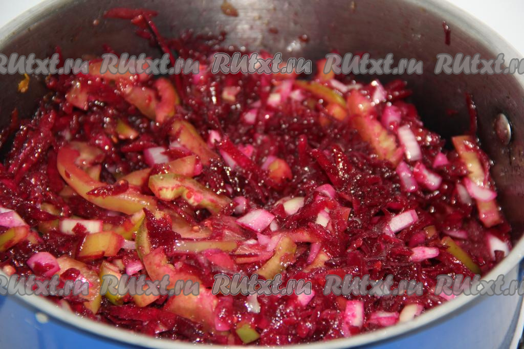 Перемешать овощи и поставить кастрюлю на огонь. Довести салат на среднем огне до кипения, накрыть крышкой. Варить салат из свеклы, помидоров и перца на среднем огне 45 минут, периодически перемешивая.