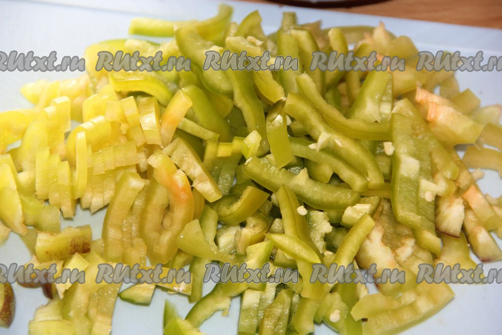 Удалить плодоножки с семенами из болгарского перца. Нарезать перец на брусочки.