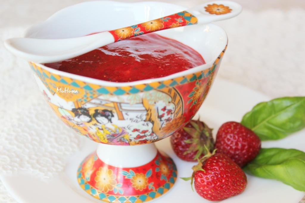 Предлагаю попробовать интересное вкусовое сочетание базилика и клубники - сладкое, ароматное, полное свежести... Приготовить десерт из клубники с базиликом несложно. Его можно подать как самостоятельное блюдо, а можно - с мороженым или в качестве крема для какого-либо пирожного или торта.