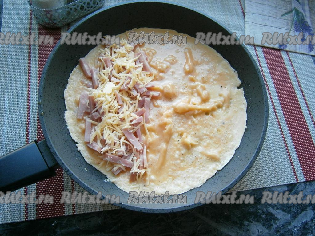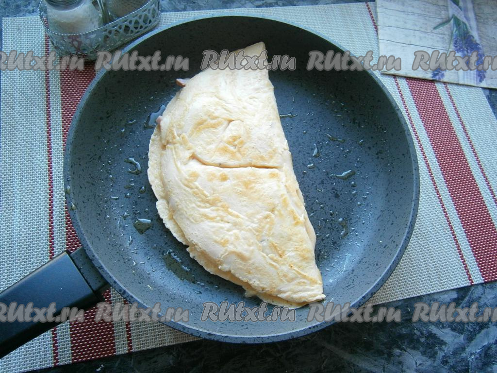 Накрыть начинку с помощью лопатки второй частью омлета (сложить, как чебурек).