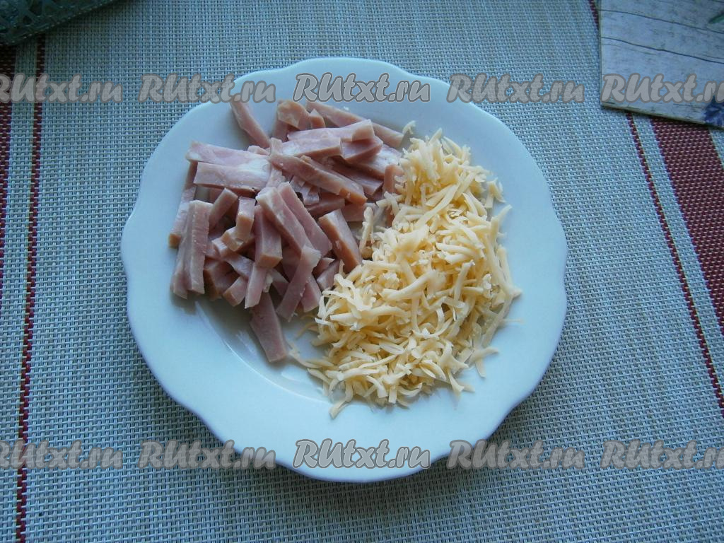 Ветчину нарезать брусочками, сыр натереть на средней тёрке.