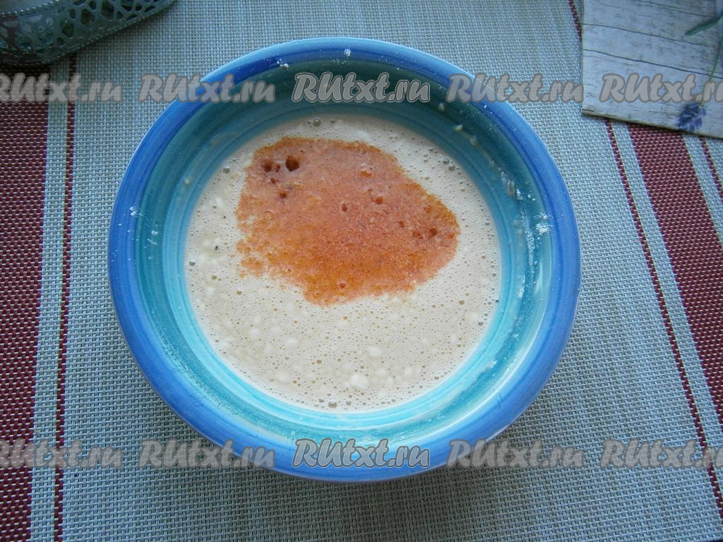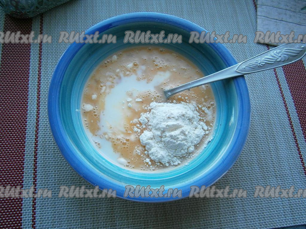 Хорошенько взбить их вилкой, влить молоко и добавить муку.