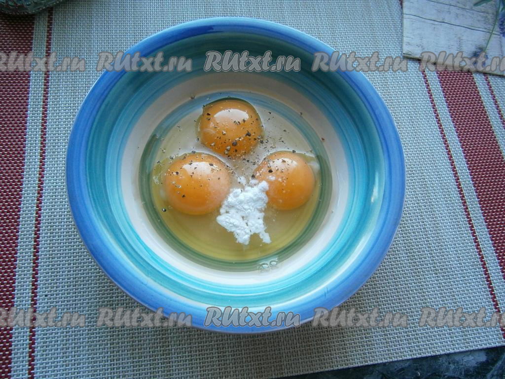 К яйцам добавить разрыхлитель, чёрный молотый перец и соль.