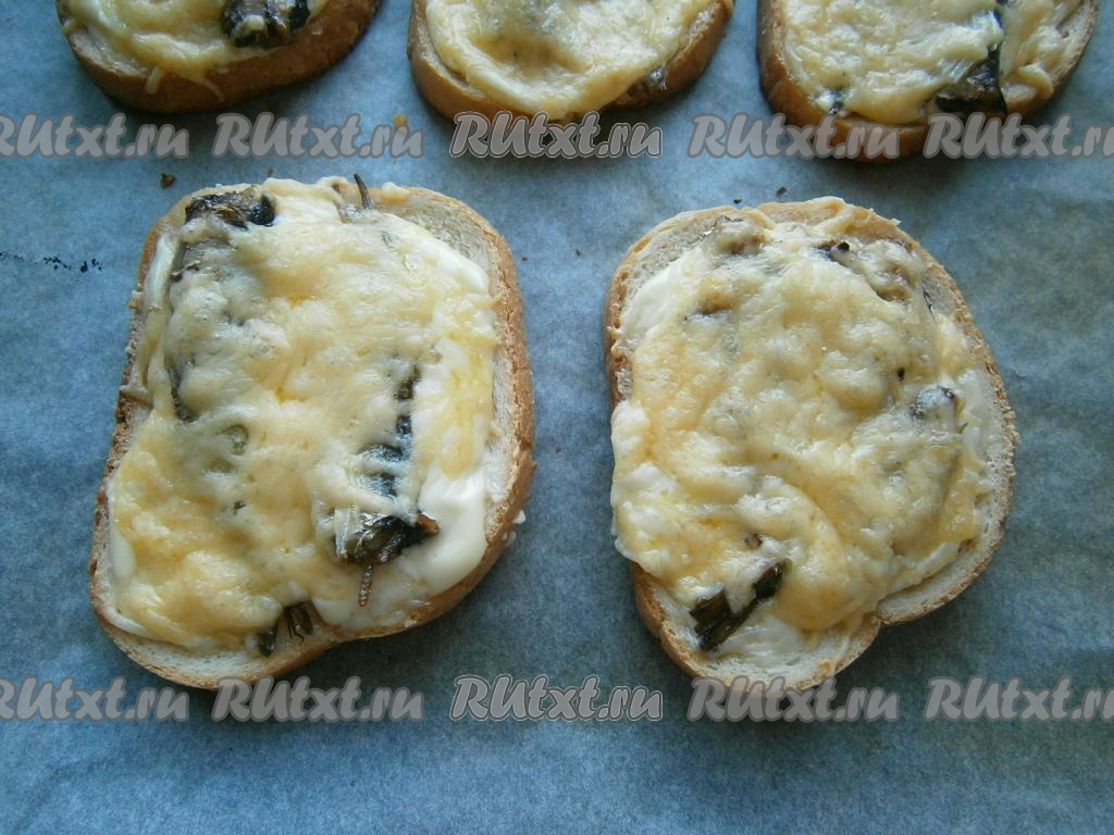 Разместить бутерброды на противне (или в форме для запекания), застеленном бумагой для выпечки.