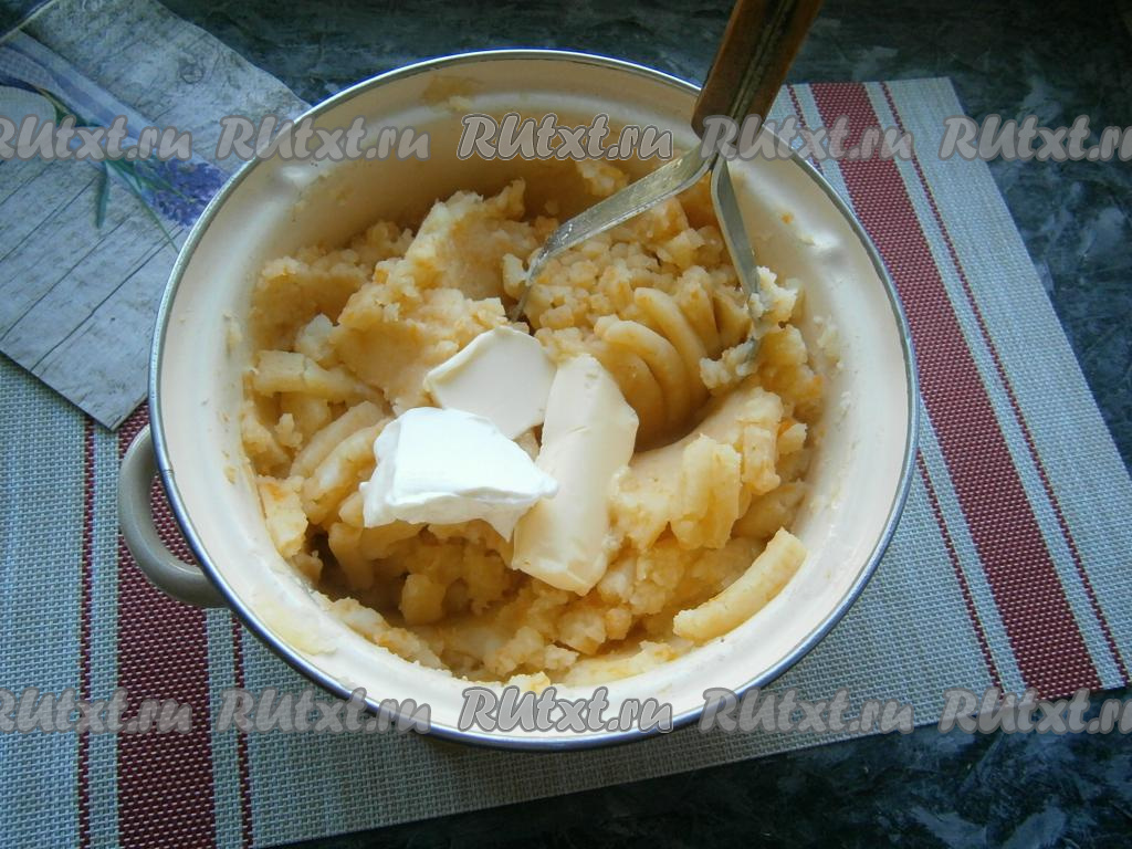 Размять овощи толкушкой, добавить сливочное масло и сметану, перемешать.