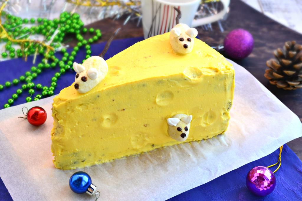 В дальнейшем я одну мышку поместила так, чтобы казалось, что она находится прямо в куске сыра. Замечательный, очень вкусный, нежный, красивый и необычный торт "Мышки в сыре" можно подавать к новогоднему столу в 2020 году!