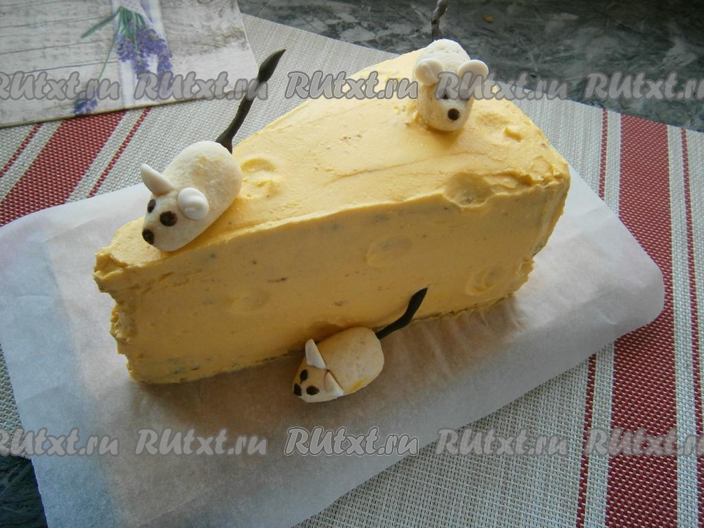 Когда торт стабилизируется, выровнять его оставшимся жёлтым кремом и снова поместить в холодильник на пару часов. Имитировать дырки можно с помощью маленьких мерных ложечек или просто оставить в таком виде - торт и так похож на кусок сыра. Расположить произвольно мышек на сыре, вставив им хвостики из шоколада.