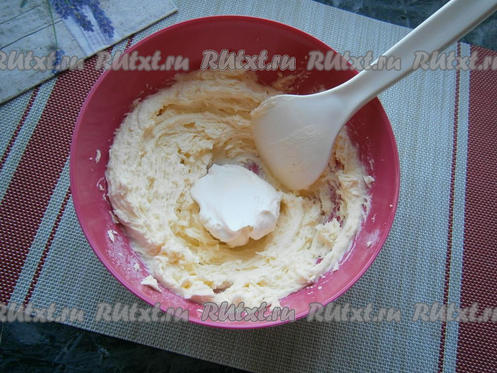 Взбить масло с сахарной пудрой миксером до пышности. Затем добавлять в него по 1-2 столовые ложки творожной массы, продолжая взбивать.