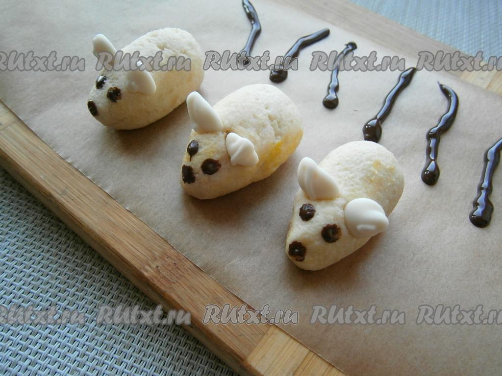Из оставленной белой массы крема и печенья вылепить мышек, вставить ушки из капель белого шоколада. Тёмный шоколад растопить, немного остудить и перелить в кондитерский мешок, срезать кончик. Сделать шоколадом глазки и носики, отсадить на пергамент полосочки в виде хвостиков (сделайте их больше, на случай, если какой-то хвостик поломается). Мышек и хвостики поместить в холодильник минут на 15 для застывания.