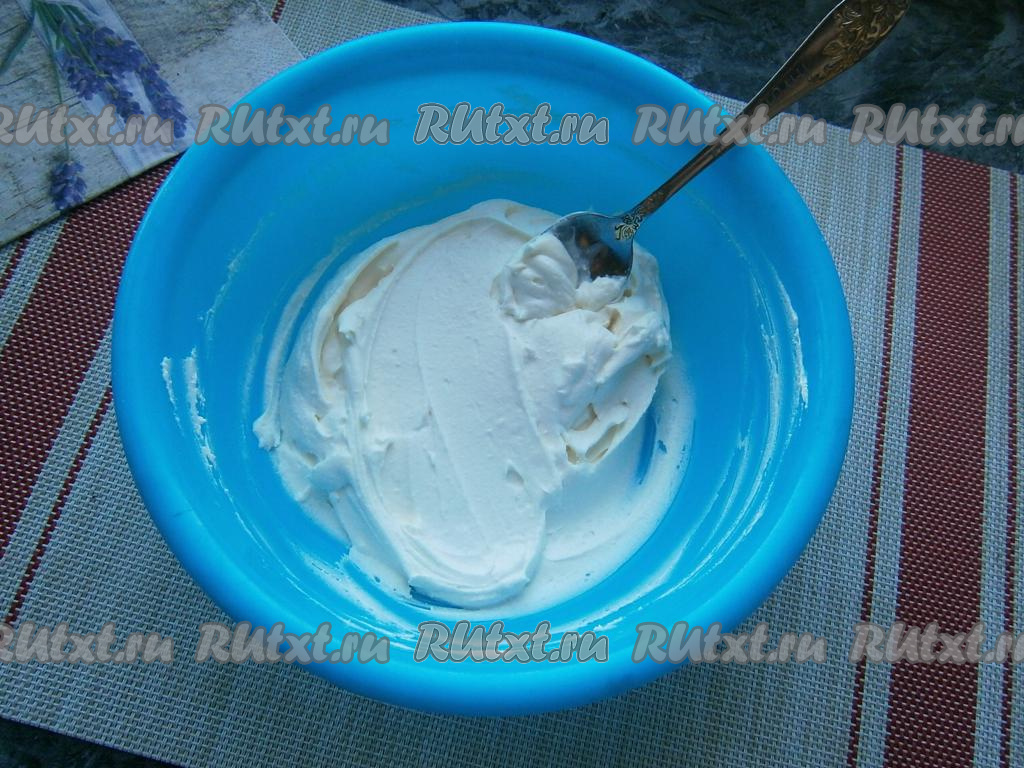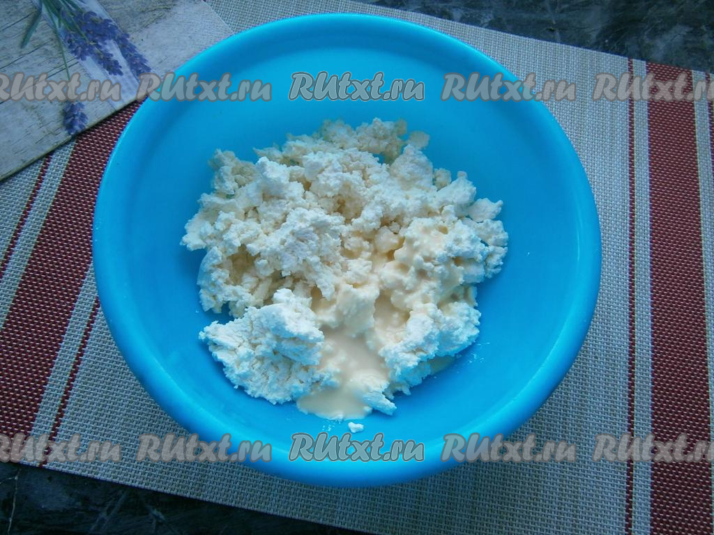 Приготовить крем: в мягкий творог добавить сгущенное молоко.
