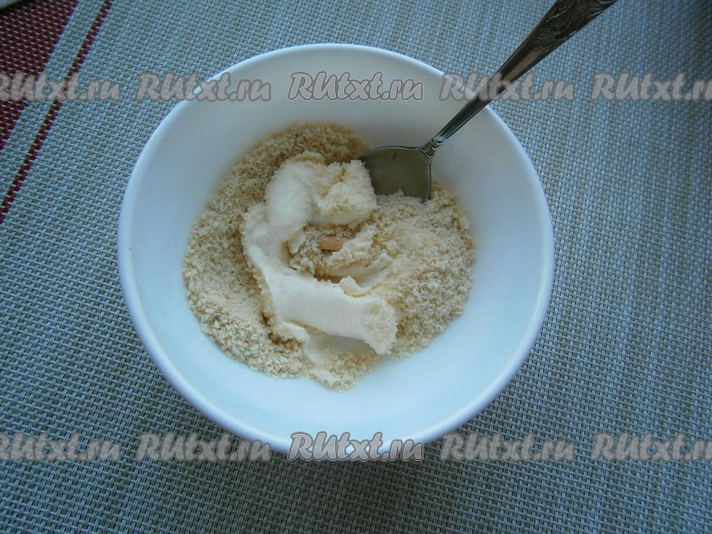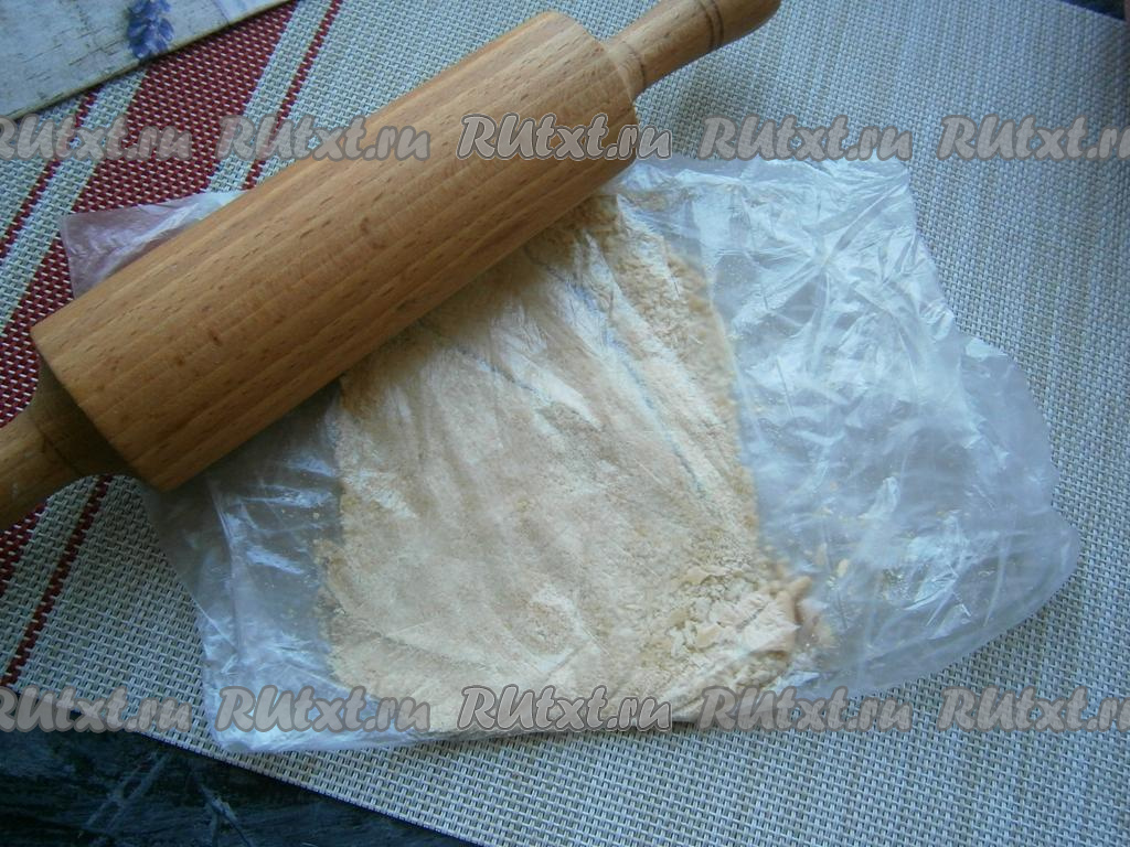 Пару штук песочного печенья поместить в целлофановый пакет и измельчить его скалкой в мелкую крошку.