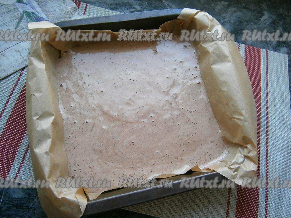 Перелить тесто в квадратную форму размером 22х22 см, застеленную полностью пергаментом.